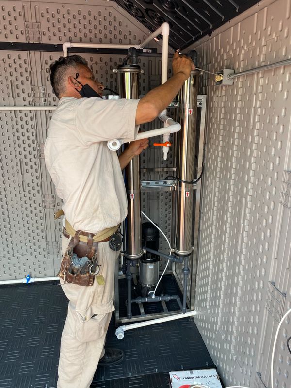 Una membrana semipermeable tiene poros pequeños que bloquean los contaminantes pero permiten que las moléculas de agua fluyan a través de ellos. En la ósmosis , el agua se vuelve más concentrada a medida que pasa a través de la membrana para obtener el equilibrio en ambos lados. La ósmosis inversa, sin embargo, bloquea la entrada de contaminantes en el lado menos concentrado de la membrana. Por ejemplo, cuando se aplica presión a un volumen de agua salada durante la ósmosis inversa, la sal se deja atrás y solo fluye agua limpia.